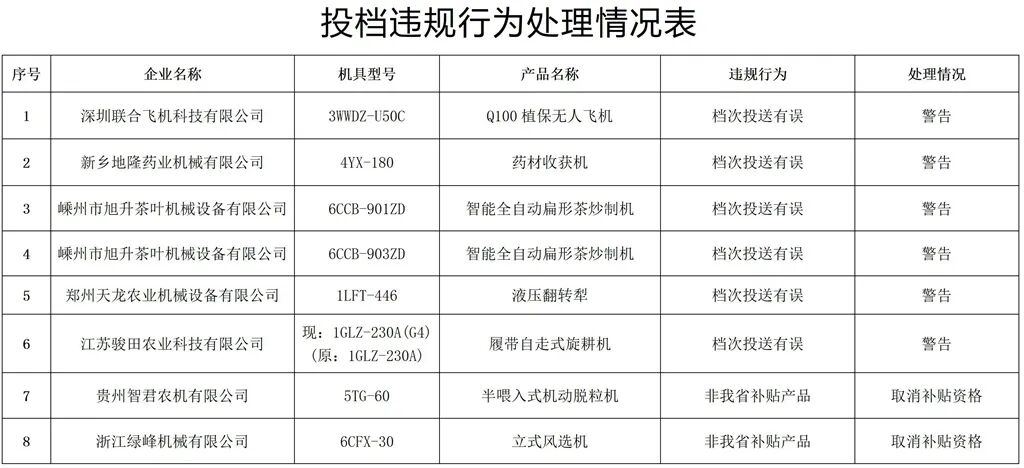我厅在2025年第一批、第二批农机购置与应用补贴产品投档专家评审中,发现7个企业8个产品存在违规行为。根据《农业部办公厅财政部办公厅关于印发<农业机械购置补贴产品违规经营行为处理办法(试行)>的通知》(农办财〔2017〕26号)和农业农村部农业机械化管理司相关规定,决定对违规产品采取相应处理措施(详见附件)。